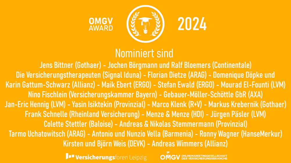 Die Online-Marketing-Gesellschaft der Versicherungsbranche verleiht den 8. OMGV Award gemeinsam mit futureworXs. Aus 36 eingereichten Vorschlägen entstand eine Shortlist mit jeweils drei Nominierten in den Kategorien Social Media / Content Marketing, Zielgruppenstrategie, Kundenbewertungen und Neue Wege. Bis zum 5. Oktober kann die Branche online und über Social Media abstimmen. Gemeinsam mit dem Votum einer Fachjury wird so entschieden, wer am 15. Oktober im Livestream ausgezeichnet wird – sowohl in der Ausschließlichkeitsorganisation als auch in der Maklerschaft.