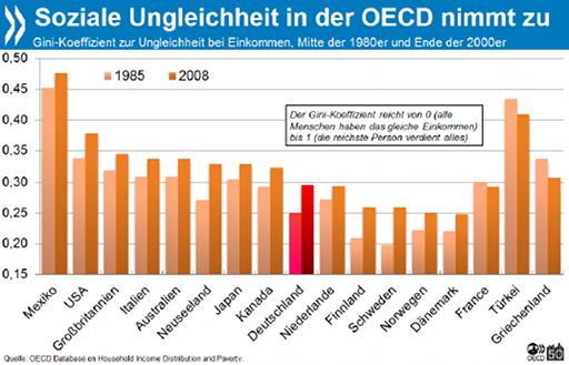 Die Studie „Divided we stand“ widerlegt die oft geteilte Annahme, dass Wirtschaftswachstum automatisch allen Bevölkerungsgruppen zugutekommt und, dass Ungleichheit soziale Mobilität fördert. „Zunehmende Ungleichheit schwächt die Wirtschaftskraft eines Landes, sie gefährdet den sozialen Zusammenhalt und schafft politische Instabilität – aber sie ist nicht unausweichlich“, sagte OECD-Generalsekretär Angel Gurría. „Wir brauchen eine umfassende Strategie für sozialverträgliches Wachstum, um diesem Trend Einhalt zu gebieten.“