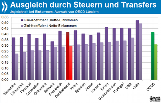 In der OECD nutzen viele Regierungen Steuern und Sozialtransfers, um die Einkommensungleichheit abzuschwächen. Die umverteilende Wirkung solcher Systeme ist in Deutschland relativ groß: Im Jahr 2008 verminderten Steuern und Transfers die Ungleichheit hierzulande um knapp 29 Prozent, verglichen mit 25 Prozent im OECD-Mittel.