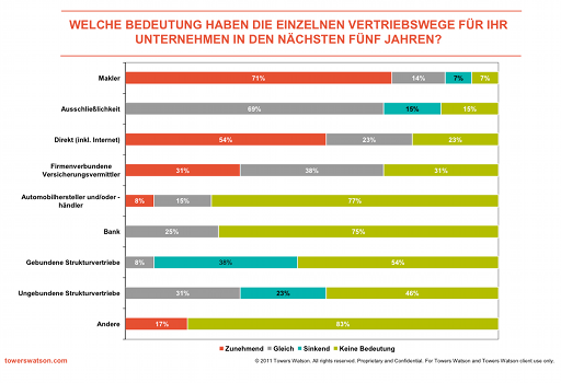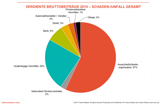 Das sind die Ergebnisse des Vertriebswege-Survey 2011 für den Bereich Schaden-/Unfall, den die Unternehmensberatung Towers Watson dieses Jahr zum sechsten Mal durchgeführt hat. Die analysierten Gesellschaften repräsentieren einen Marktanteil von rund 75 Prozent der Prämieneinnahmen 2010.