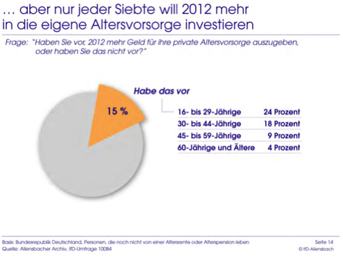 „Mit einem solchen Modell hat jeder Bürger zu jeder Zeit seine Versorgungslücken und seinen aktuellen Vorsorgebedarf vor Augen. Mehr als jeder gut gemeinte Rat würde dies die Menschen antreiben, sich um die eigene Altersvorsorge zu kümmern, und auch langfristig durchzuhalten. In Dänemark wird das Modell bereits erfolgreich praktiziert. Wir sollten auch in Deutschland dafür die erforderliche Rechtsgrundlage schaffen“, so Zimmerer. Die Allensbach-Ergebnisse zeigten, so Zimmerer, dass den Menschen die Bedeutung zusätzlicher Altersvorsorge durchaus bewusst sei. Je früher deren Aufbau begonnen werde, umso niedriger sei der dafür aufzuwendende Betrag. „Wer zehn Jahre früher mit der Altersvorsorge beginnt, verringert seine Belastung deutlich, je nach Situation um 30 bis 50 Prozent. Deshalb ist es so wichtig, vor allem die junge Generation rechtzeitig zum Sparen für ihre Altersvorsorge zu motivieren.“