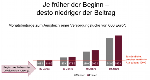 Die Bürger erwarten für sich selbst eine Rentenlücke von im Schnitt 600 Euro. Doch trotz der verbreiteten Gewissheit, sich ohne zusätzliche Altersvorsorge später deutlich einschränken zu müssen, handeln die Menschen nicht danach: Ausgaben für Produkte der Altersvorsorge erfreuen sich keiner großen Beliebtheit. Nur 24 Prozent der Befragten sind bereit, einiges für die Altersvorsorge auszugeben. Damit rangiert die Altersvorsorge weit abgeschlagen auf Platz zehn der abgefragten Ausgaben.