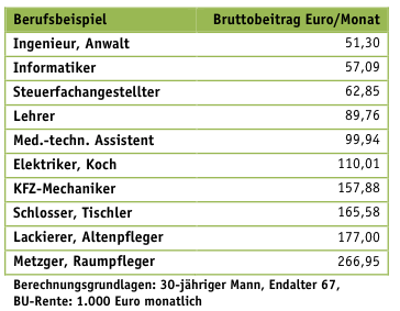 Bereits seit einigen Jahren gibt es im BU-Geschäft den Trend, die Kalkulation in eine immer größere Anzahl von Berufsgruppen aufzusplitten. Früher war es üblich, nur zwischen kaufmännischen Berufen und Berufen mit körperlicher Tätigkeit zu unterscheiden. Mittlerweile teilen Anbieter Neukunden in bis zu 10 verschiedene Berufsgruppen ein. Ziel ist eine Top-Position im (Preis-) Kampf um die besten „Risiken“, also Verbrauchern mit sehr geringem Risiko, berufsunfähig zu werden. Für die Berufsgruppen mit niedrigeren Risiken werden in der Folge geringere Beiträge kalkuliert. In Berufsgruppen mit höherem Risiko wird der Versicherungsschutz dagegen so teuer, dass ihn sich kaum noch jemand leisten kann. Für körperlich Tätig haben sich die Preise in den letzten Jahren zum Teil vervierfacht. Mit dieser immer kleinteiligeren Berufsgruppen-Differenzierung wird der Versicherungsgedanke faktisch ad absurdum geführt. Verbraucher, die den Schutz am wenigsten brauchen, erhalten ihn immer günstiger, für die anderen wird er nahezu unbezahlbar.