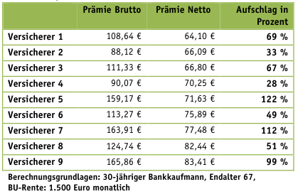Strategie 2: Neuverträge in der BU-Versicherung werden mit günstigen Nettoprämien angeboten. Die Bruttoprämien jedoch (die der Verbraucher oft nur am Rande wahrnimmt) werden hoch angesetzt. Hohe Differenzen zwischen Netto- und Bruttoprämie von bis zu über 100 Prozent sind keine Seltenheit. Das Versicherungsunternehmen kann die Beiträge des Versicherten dann zukünftig bis zur vereinbarten Bruttoprämie erhöhen, so dass die anfangs günstige BU-Versicherung sich nach und nach deutlich verteuert. Bei einer hohen Differenz zwischen Netto- und Bruttobeitrag sollten Verbraucher daher misstrauisch werden.